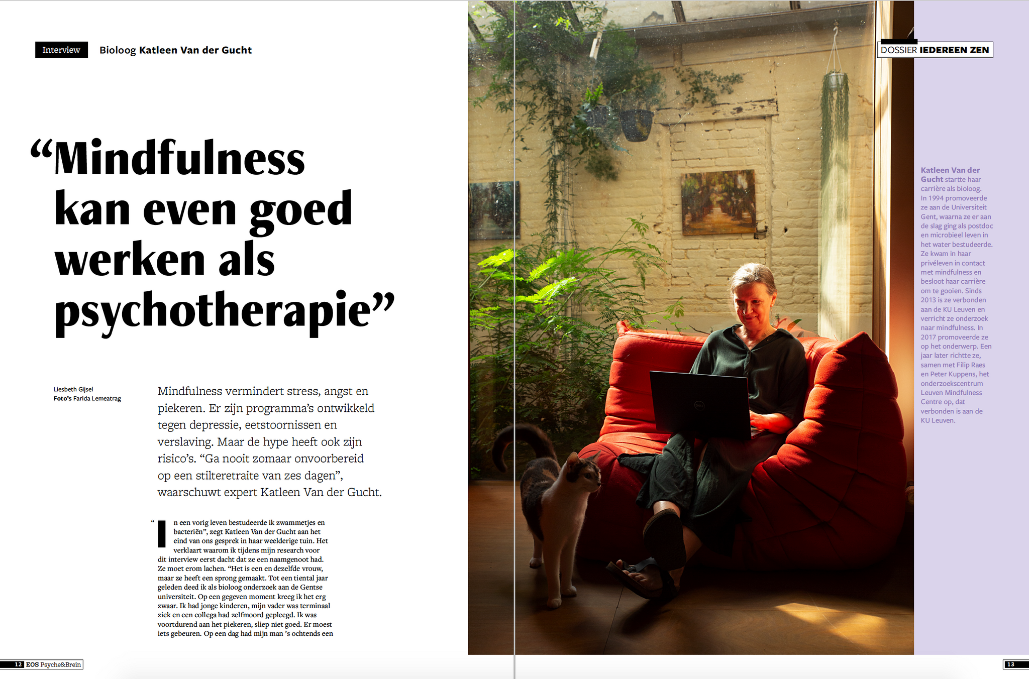Dossier Iedereen Zen. Een therapie gebaseerd op mindfulness kan even effectief zijn tegen een depressie als antidepressiva of de klassieke psychotherapie. Het helpt ook tegen stress, net als yoga en tai chi. En in de Verenigde Staten gaan stemmen op om spiritualiteit te integreren in psychotherapie, omdat dat de resultaten verbetert.