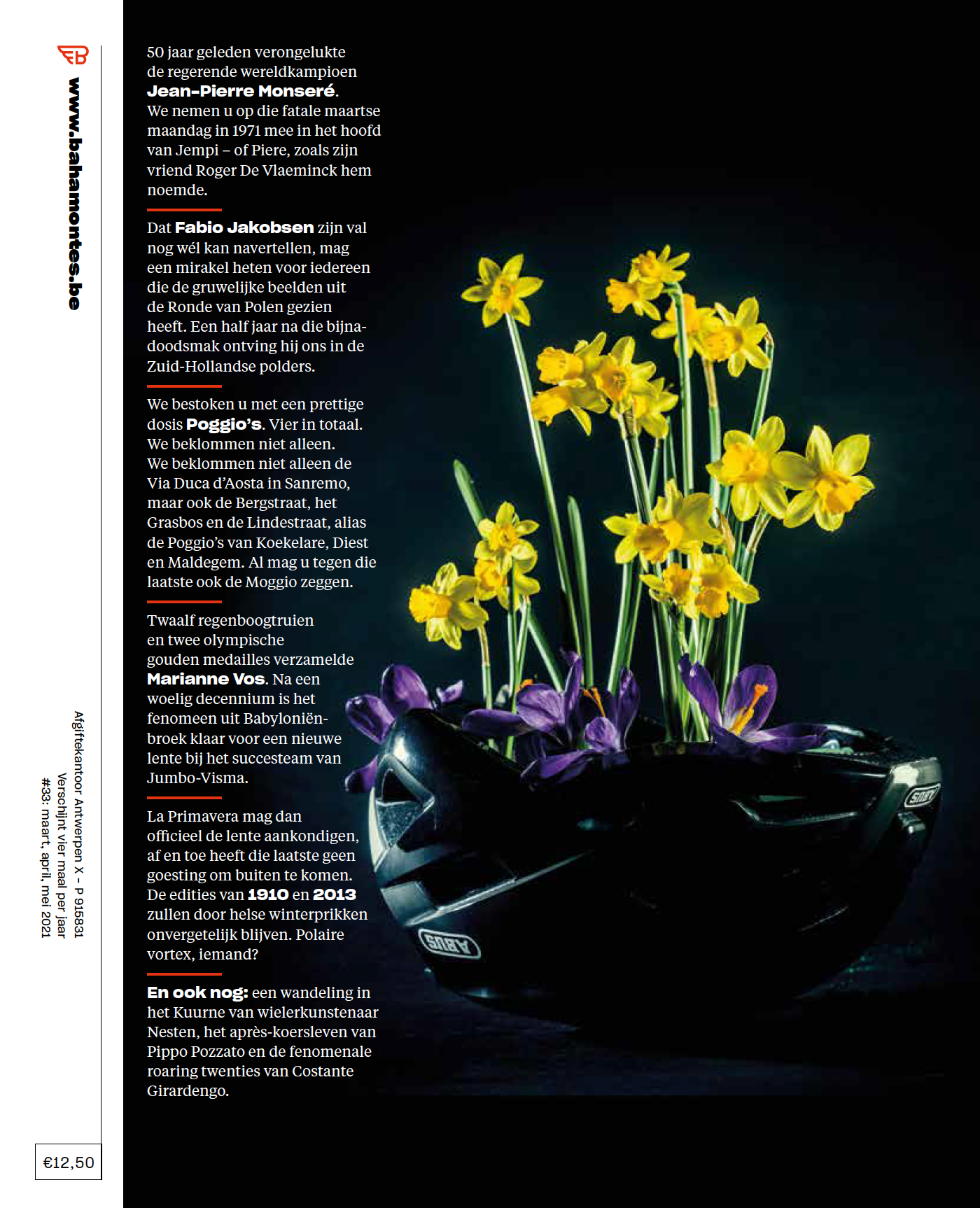 300 kilometer, van Milaan naar Sanremo, over de Turchino (behalve dit jaar dus) langsheen de Ligurische kust. De eerste, echte klassieker van het seizoen, en ook de prelude van ontluikende hoop, zowel in de koers als in het leven. In dit nummer gingen we op zoek naar de ziel van Sanremo, schuimden we de Vlaanders af op zoek naar diverse Poggio’s, kropen we in het hoofd van Jempi Monsére tijdens zijn laatste uren, spraken we met Marianne Vos en mochten we op bezoek bij Fabio Jakobsen, zes maand geleden nog in coma, nu terug profrenner en ab-so-luut klaar voor een Nieuwe Lente, een Nieuw Leven zelfs.