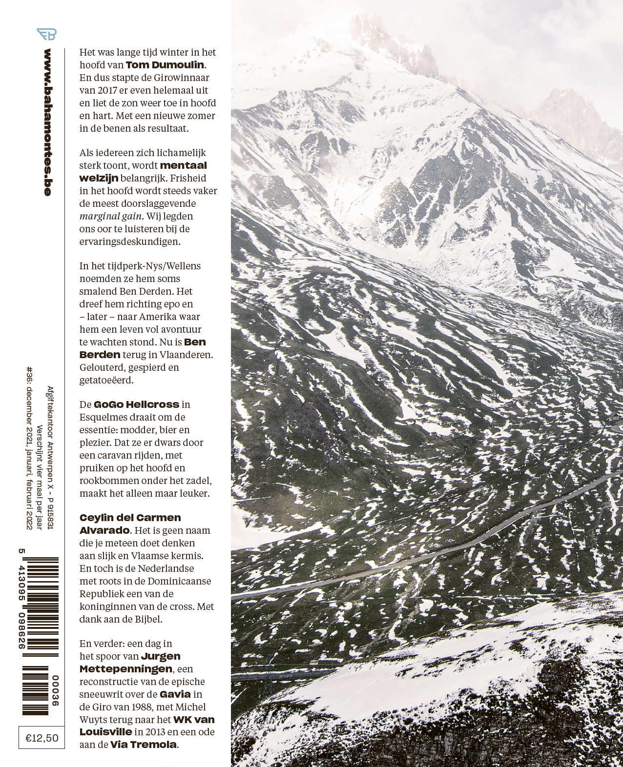 Het wielerseizoen 2021 was er eentje dat we kunnen catalogeren onder de noemer ‘Grand Cru’. En dat geldt ook voor deze Bahamontes. Getiteld: Koning Winter. Een nummer waarin we openhartig babbelen met Tom Dumoulin die na de winter in zijn hoofd eindelijk weer zomer in de benen voelt. We noteerden het levensverhaal van Ben Berden die na omzwervingen in Amerika terug in Vlaanderen is - gelouterd, gespierd én getatoeëerd. We gingen op bezoek bij Ceylin del Carmen Alvarado, een van de nieuwe koninginnen van de cross. We reconstrueren de apocalyptische sneeuwjacht over de Gavia in de Giro van 1988 en we keren terug naar het WK Cyclocross in 2013, in Louisville, de Verenigde staten. We brengen odes in woord en beeld aan de allereerste Vrouwen in de Hel én aan de Via Tremola, een Zwitserse parel waar de eeuwige sneeuw altijd knispert. En nog veel, veel meer…